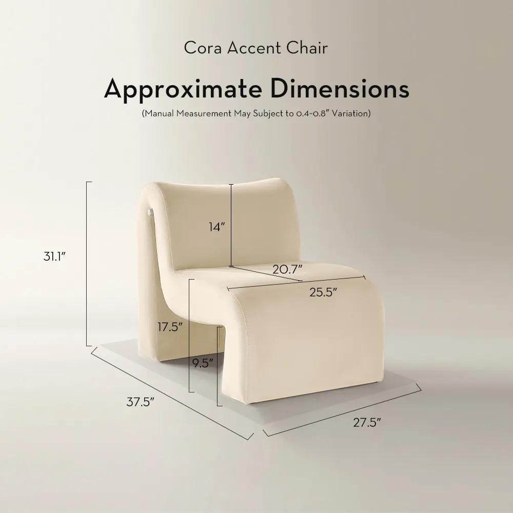 Cora feels like a modern contour drawing translated into upholstery. The low, lounging seat sweeps forward, then folds upward into a gently reclined back, wrapping the body in a smooth, uninterrupted curve. In an all-neutral scheme, this white accent chair becomes the sculptural anchor amid layered textures; against darker woods or marble, the ivory velvet glows softly, highlighting the slim gold inlay that catches light as you move around the room. Style it beside a pedestal table and floor lamp for a reading corner, or pair two with a luxe sofa to create a contemporary living room furniture arrangement that feels curated yet effortless.