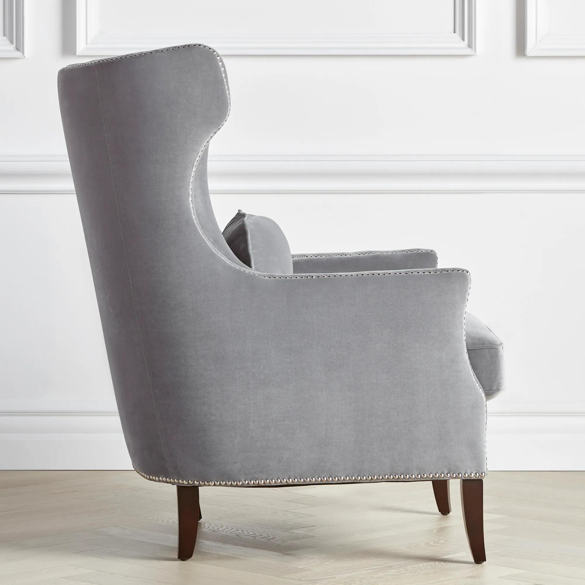 Double rows of hand-applied nailhead trim accentuate the curvy silhouette of our Davis accent chair. Designed with a modern wingback frame and upholstered in plush velvet, its generous proportions, rounded back, and removeable lumbar pillow ensure this piece is as comfortable as it is stylish. Shown in Royale Plush Velvet Ash.