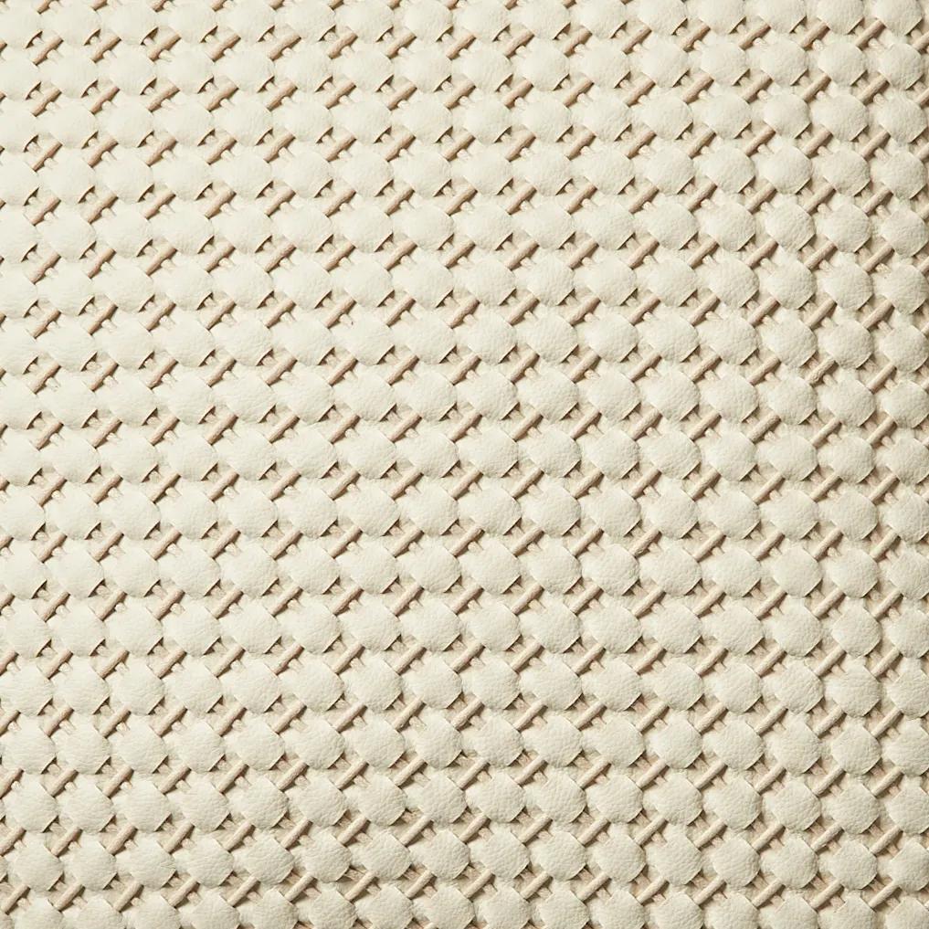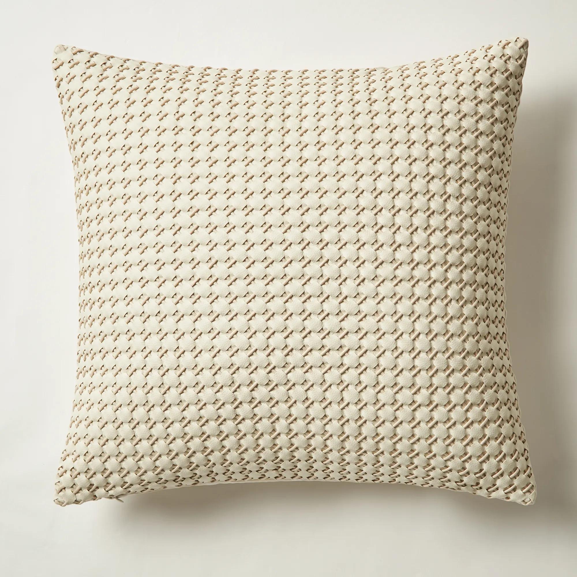 An elevated accent to any sofa or bed, our Estelle pillow is made from a faux cream leather with monochromatic woven rope detail. Removable cover with hidden zipper closure. Plush feather down Insert included.