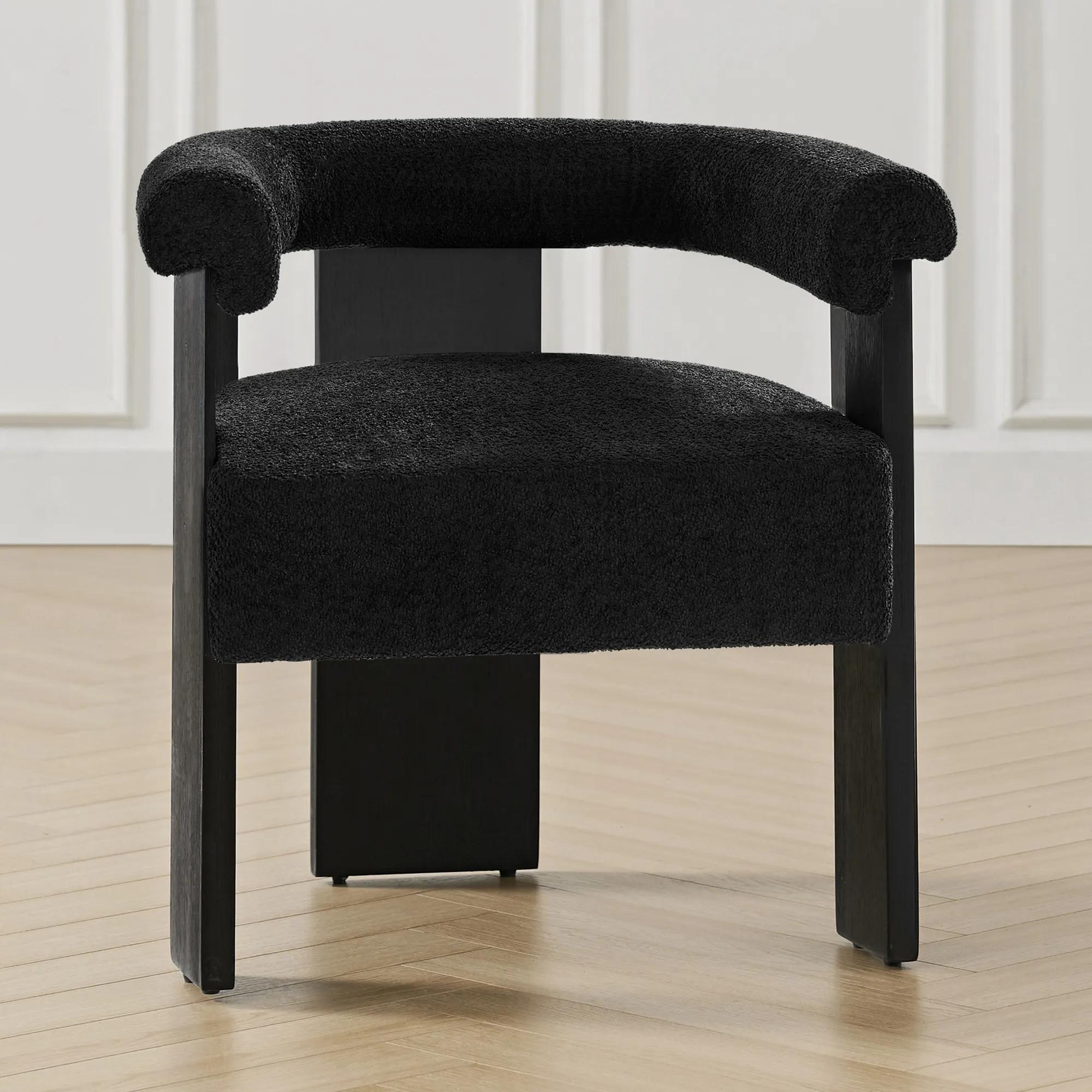Fedor Dining Chair offers modern elegance with its sleek design. Upholstered in quality boucle fabric, the dining chair offers a comfortable and inviting seating experience. The round backrest adds a contemporary flair, creating a visually appealing silhouette that complements various dining spaces. With a harmonious blend of comfort, style, and quality craftsmanship, the dining chair is not just a piece of furniture but a statement of refined taste and contemporary living.