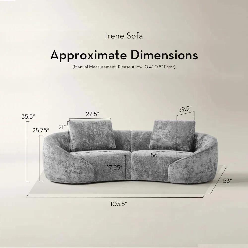 Enhance your living room with the Irene Sofa, a stunning blend of comfort and contemporary design. Fully upholstered in luxe chenille fabric, this sectional features high-density foam cushioning for a truly superior sofa. Its elegant curved design and spacious seating make it an ideal spot for intimate gatherings and lively entertaining alike.