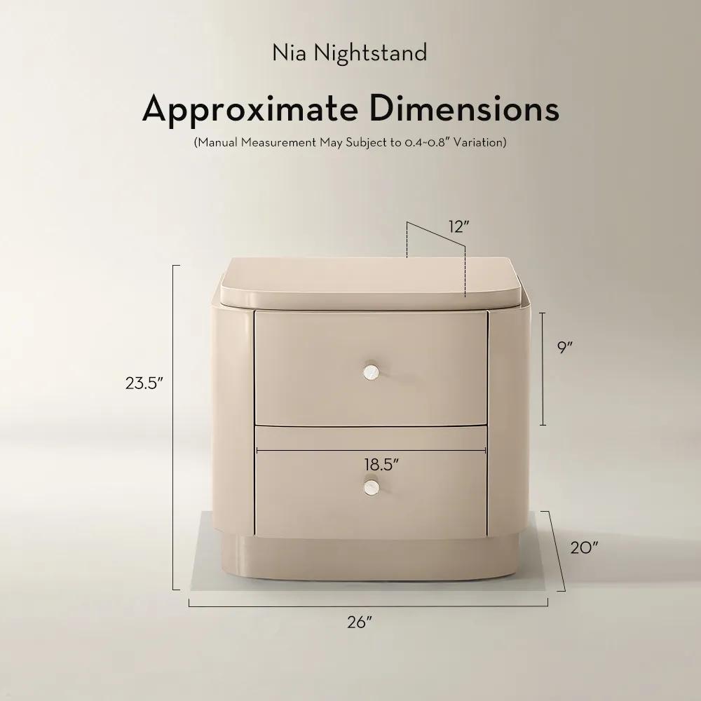 Crafted from engineered wood in a smooth Turtle Dove lacquer, the Nia Lacquered Modern Nightstand with softly rounded corners and a gently curved front, elevated by pearlescent pulls and a marble-inspired base detail. Two soft-close drawers glide quietly, keeping bedside essentials organized while preserving a serene, clutter-free surface.