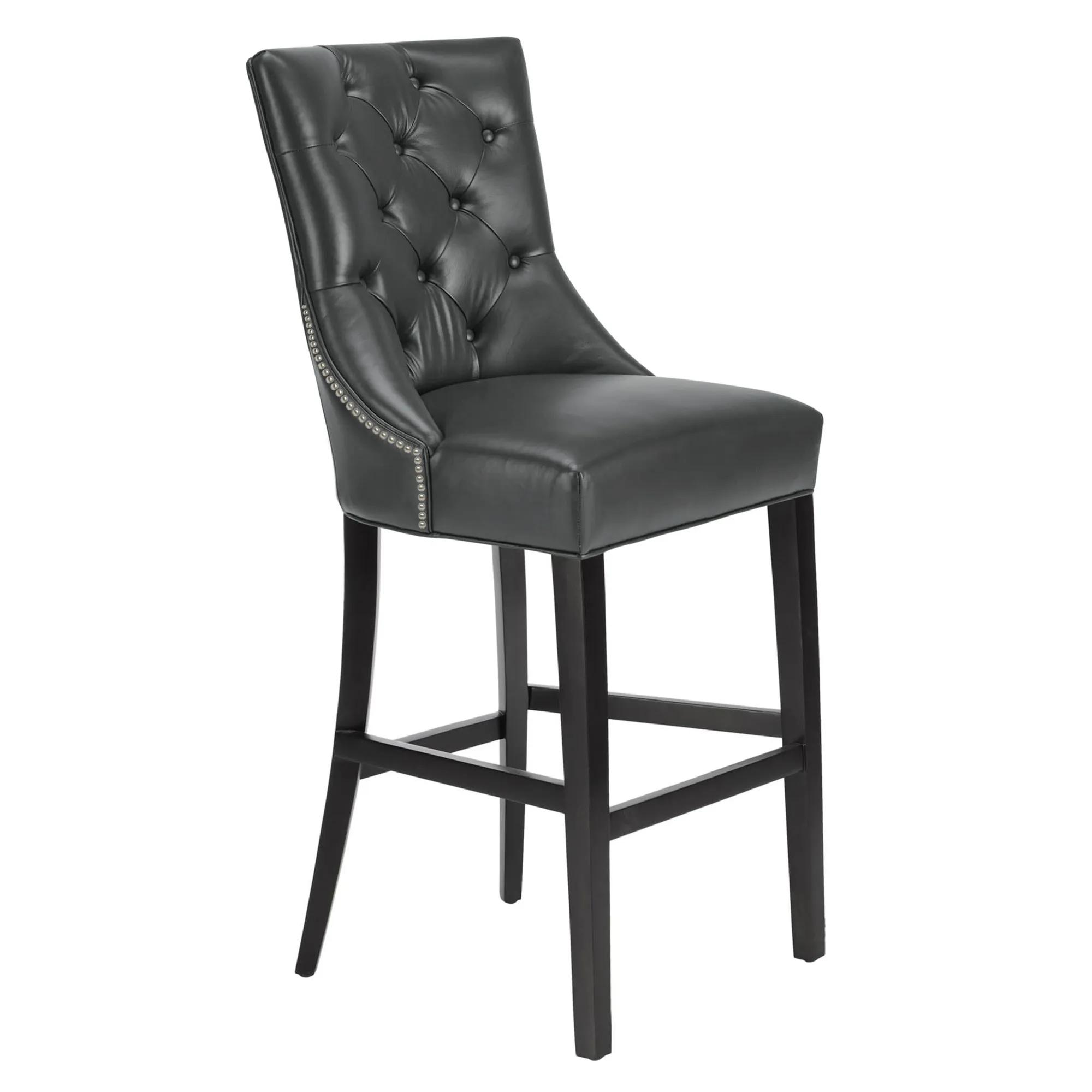 A relaxed pitch and low, sheltering arms give this stool an understated elegance, and comfort that encourages leisurely dining. Shown in Cortina Leather Charcoal with bright nickel nailheads.