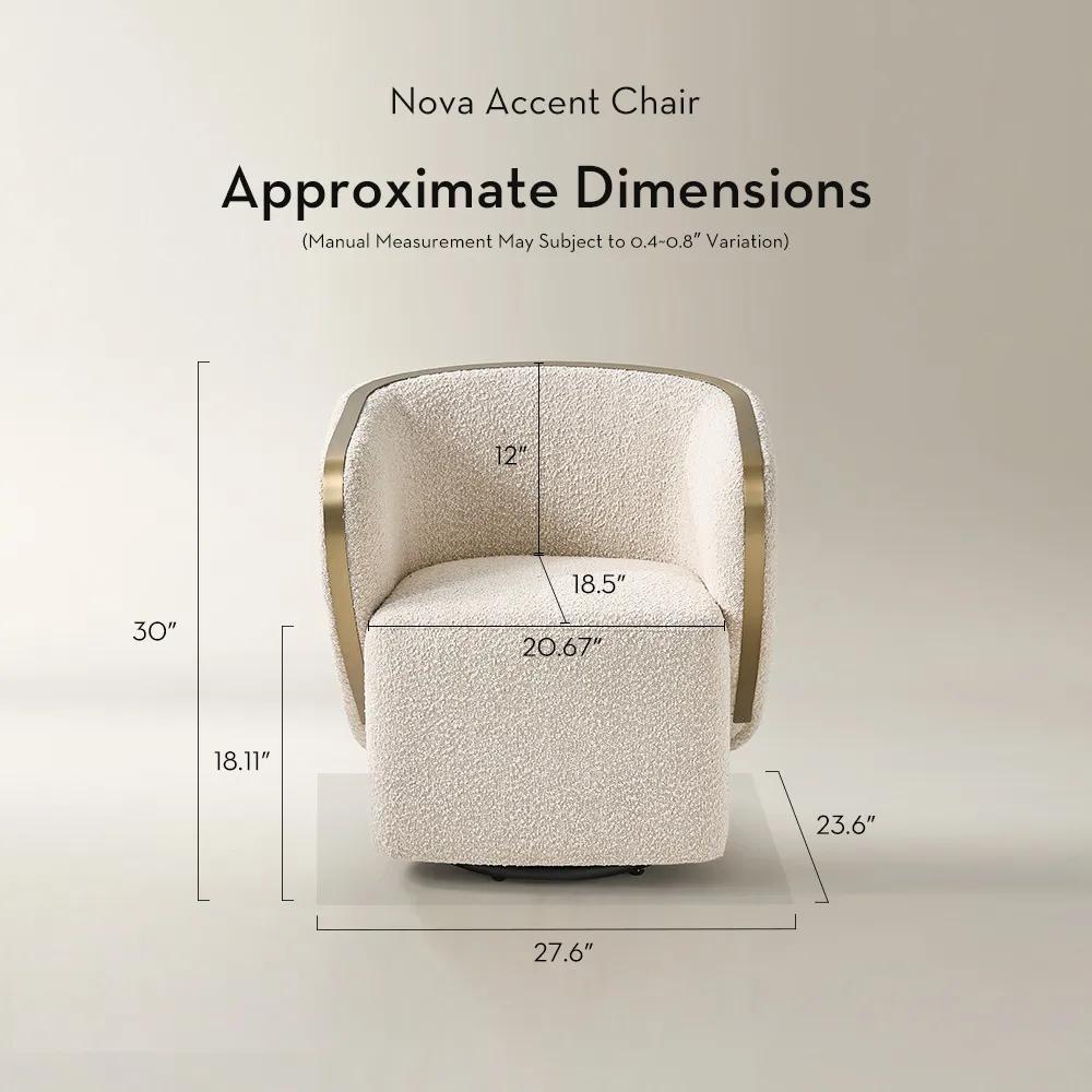 Constructed with a kiln-dried birch and engineered-wood frame, the Nova Modern Accent Chair in Ivory boucle isnulla water-repellent performance boucle over sinuous springs and high-resiliency foam is elevated by a sculpted wraparound back and metallic-edged silhouette. A concealed 360-degree swivel base keeps movement smooth and quiet, bringing lounge-level comfort to dining, desk, or vanity settings.