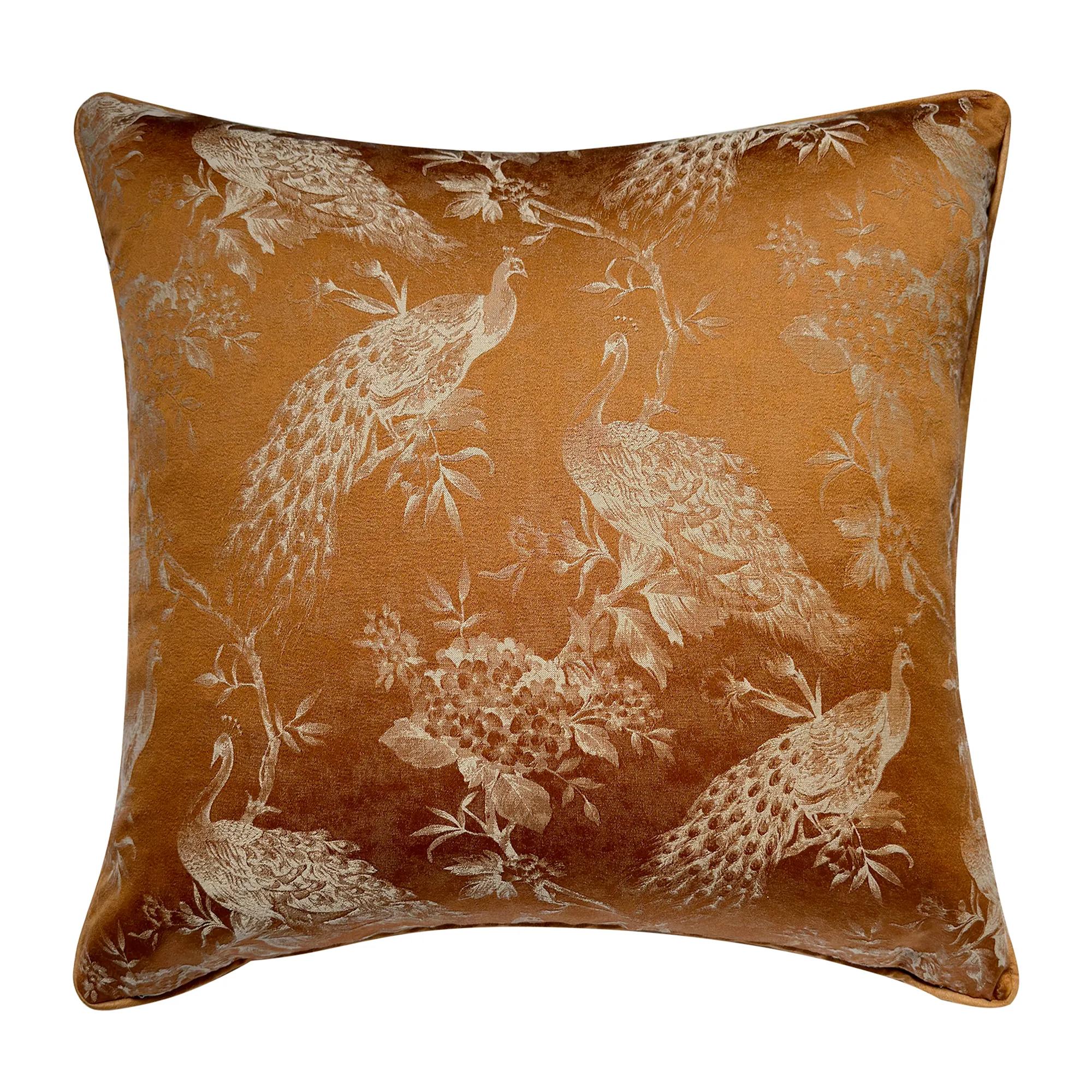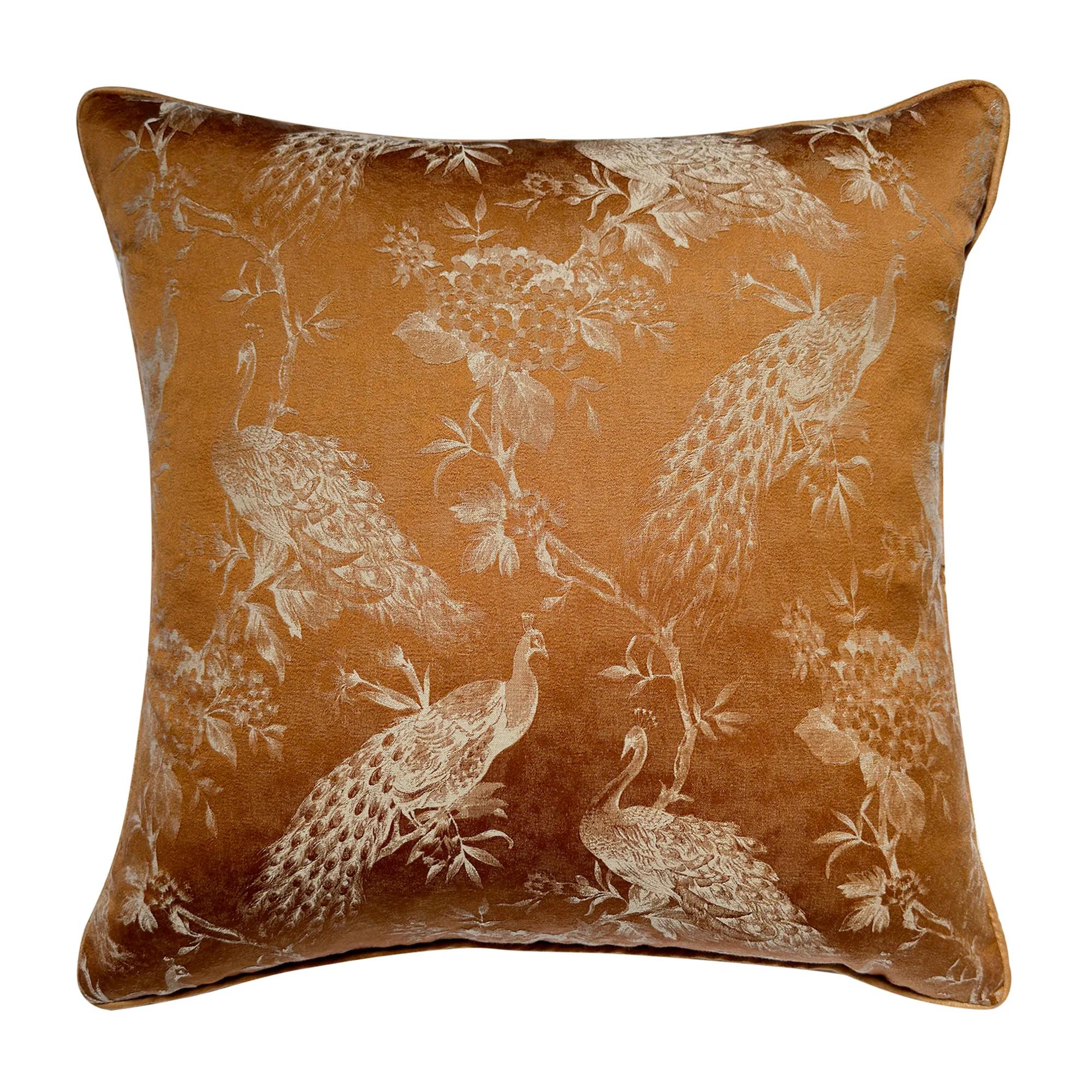 Adorned with a stunning jacquard antique peacock pattern, our pillow exudes timeless charm and sophistication. Complemented by coordinating solid color piping, it adds a touch of romance to any space. Elevate your home decor with The Peacock Pillow and immerse yourself in its captivating beauty. Removable cover with hidden zipper closure. Plush feather down Insert included.