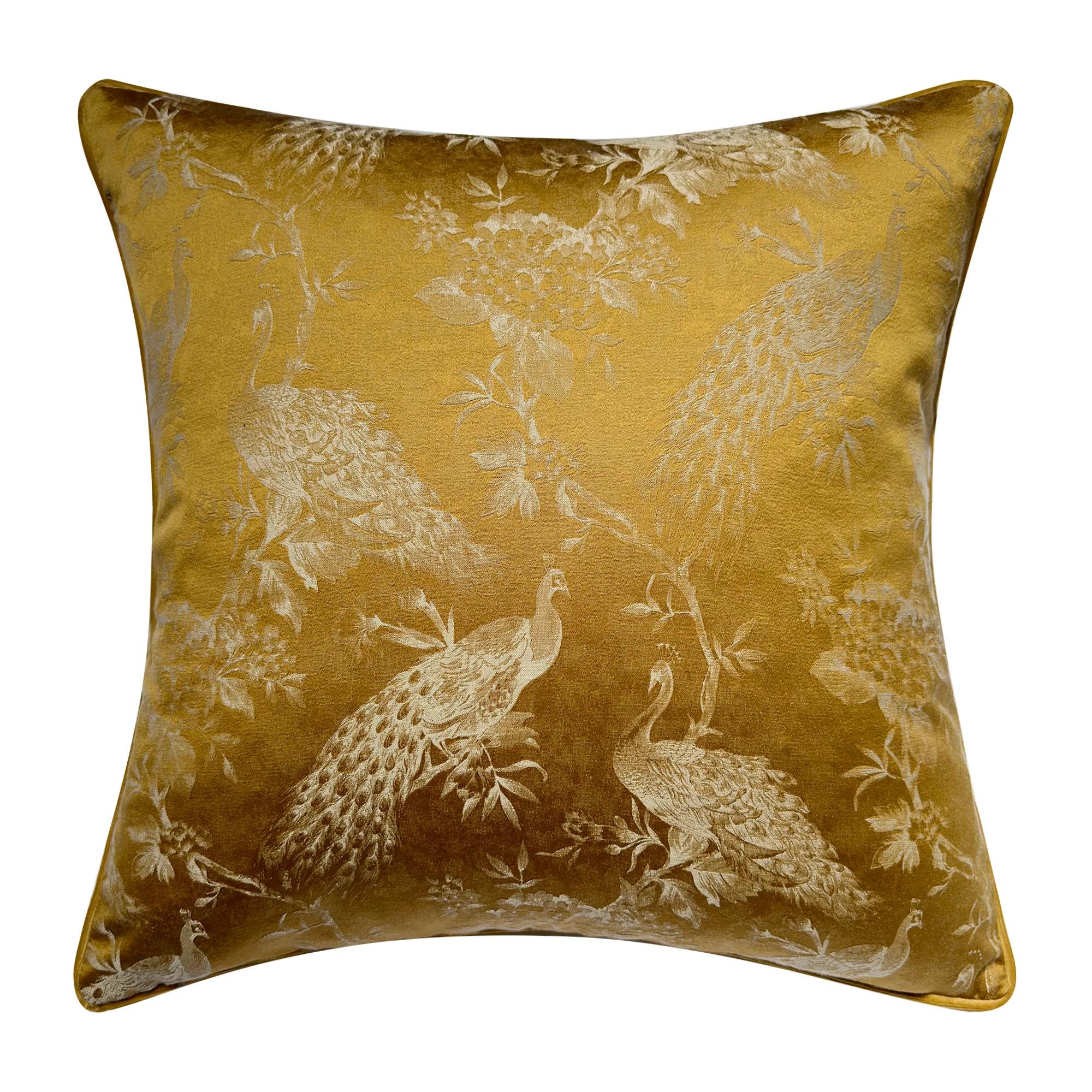 Adorned with a stunning jacquard antique peacock pattern, our pillow exudes timeless charm and sophistication. Complemented by coordinating solid color piping, it adds a touch of romance to any space. Elevate your home decor with The Peacock Pillow and immerse yourself in its captivating beauty. Removable cover with hidden zipper closure. Plush feather down Insert included.