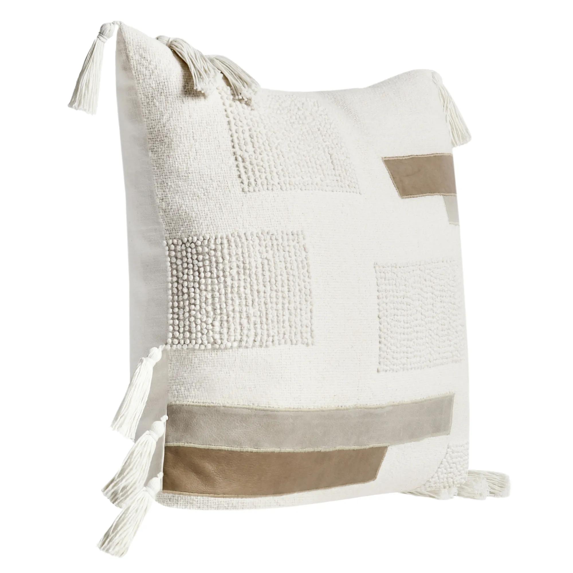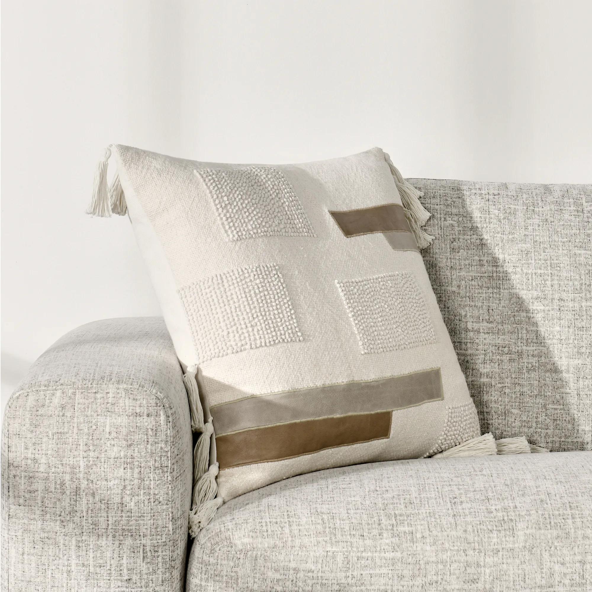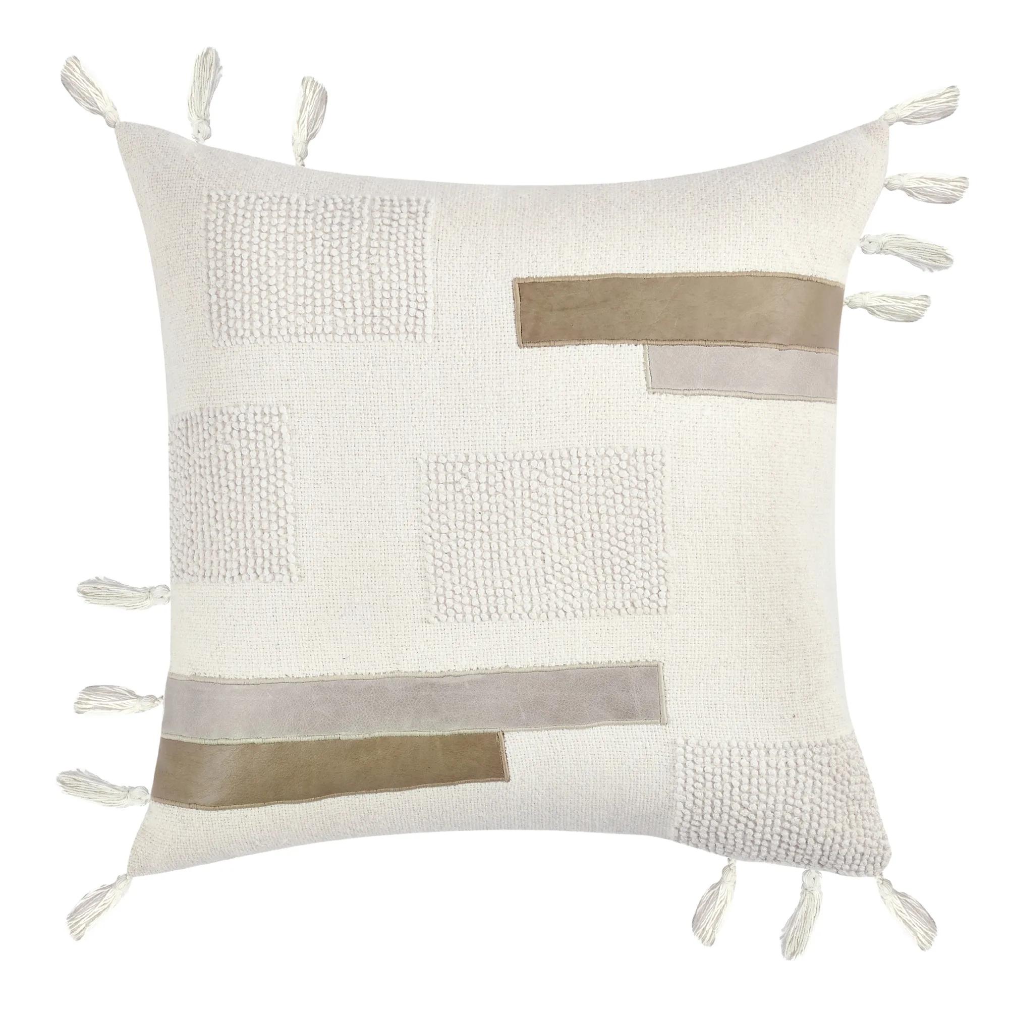 The Zayn pillow is a handcrafted pillow that seamlessly blends various neutral tones, textures, and fabrics to create a captivating and harmonious design. Featuring individually applied pieces of leather and hand-knotted embroidery, this geometrically-sound pillow will elevates any living space. The soft feather blend insert also provides a luxurious supportive feel.